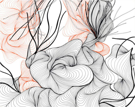 "Electric Threads" es una Buena muestra del increíble trabajo de esta artista de Seattle. Sus obras, hechas a base de lápices y tinta, están realizadas a mano, sin seguir bocetos previos. Casi como una “escritura automática” que desvela una caligrafía de curvas que nacen de su propia imaginación. Sus cuadros y murales tienen una delicada elegancia. Un lenguaje propio que deja entrever misteriosas composiciones de corte orgánico.